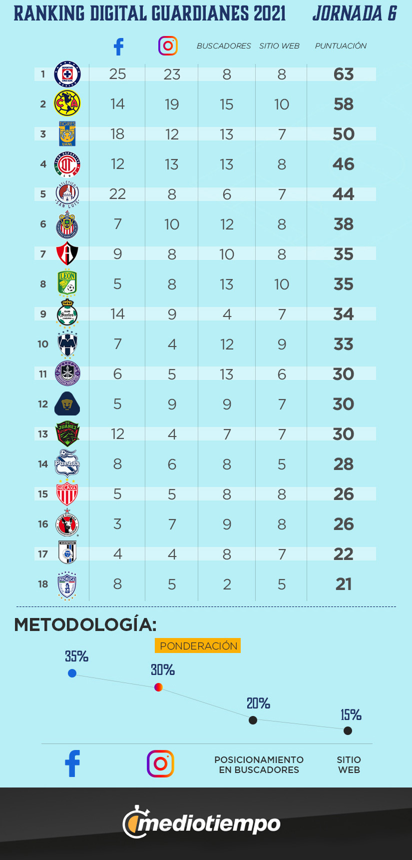La evaluación de los equipos de la Liga MX en el torneo Guard1anes Clausura 2021 se hace semanalmente basada en: Facebook, Instagram, relevancia en buscadores y sitio web.