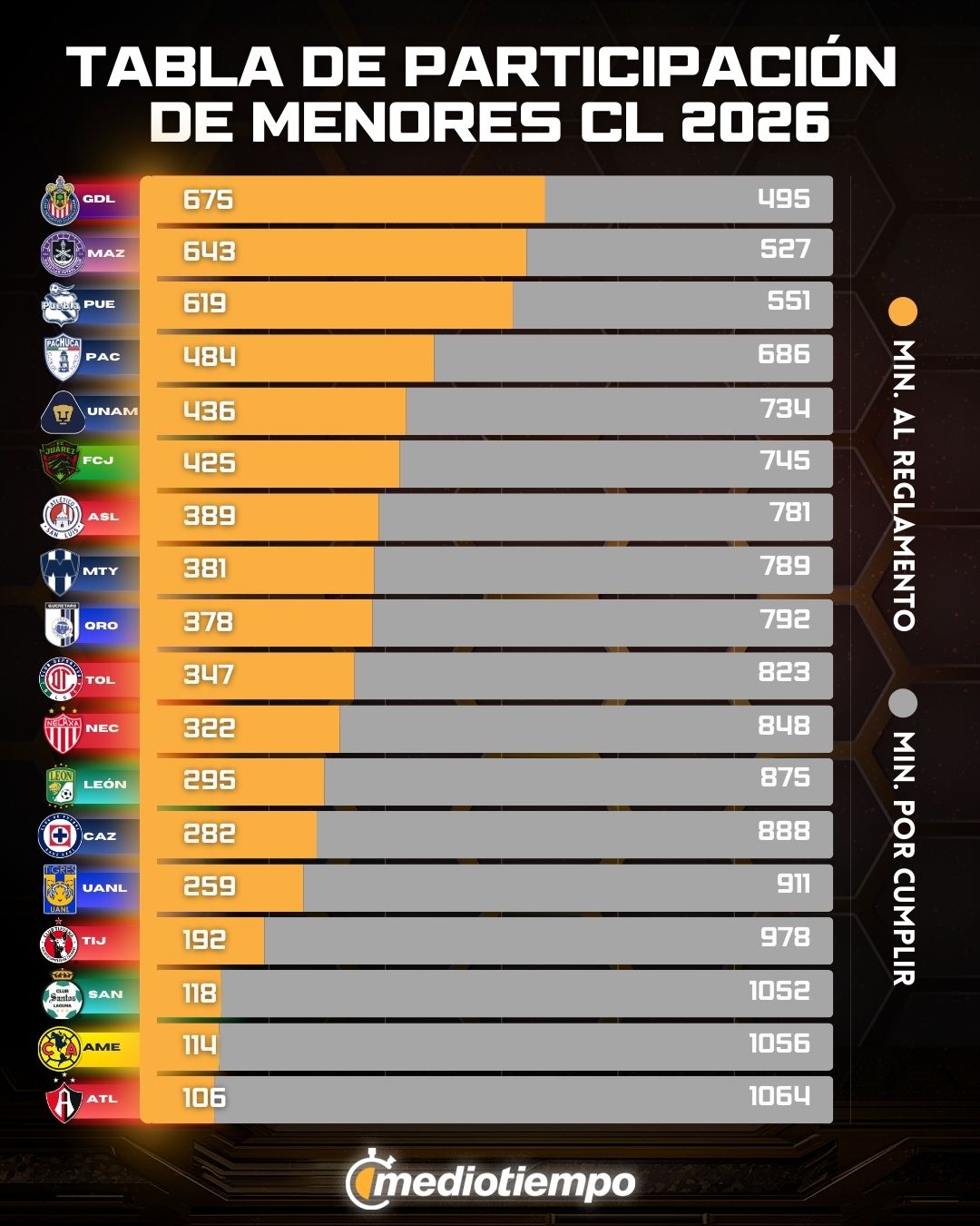 Chivas lidera la tabla con un buen margen pese a que recién inició el torneo, seguido por Mazatlán en su gira del adiós, Puebla, Pachuca y Pumas, que ocupan los primeros cinco puestos habiendo alineado a 10 menores; Gabriel Milito les ha dado 815 minutos a los jóvenes, de los cuales 675 van al reglamento.