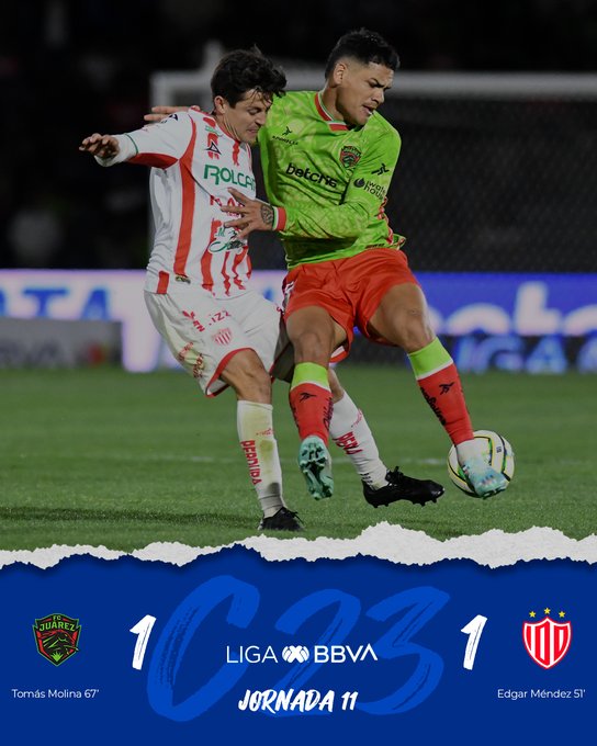 FC Juárez y Necaxa le dieron el cerrojazo final a la Jornada 11 del Clausura 2023 con un aguerrido empate 1-1 en el Estadio Olímpico Benito Juárez. Los visitantes se fueron adelante en el marcador gracias a la anotación de Edgar Méndez y el empate llegó por medio de los pies de Tomás Molina.