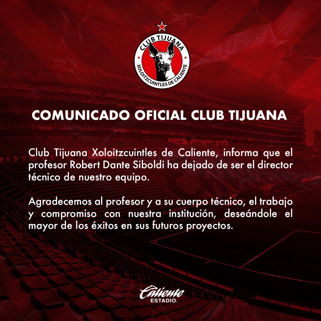 "Club Tijuana Xoloitzcuintles de Caliente informa que el profesor Robert Dante Siboldi ha dejado de ser el director técnico del equipo. Agradecemos al profesor y a su cuerpo técnico, el trabajo y compromiso con nuestra institución", señaló Xolos.