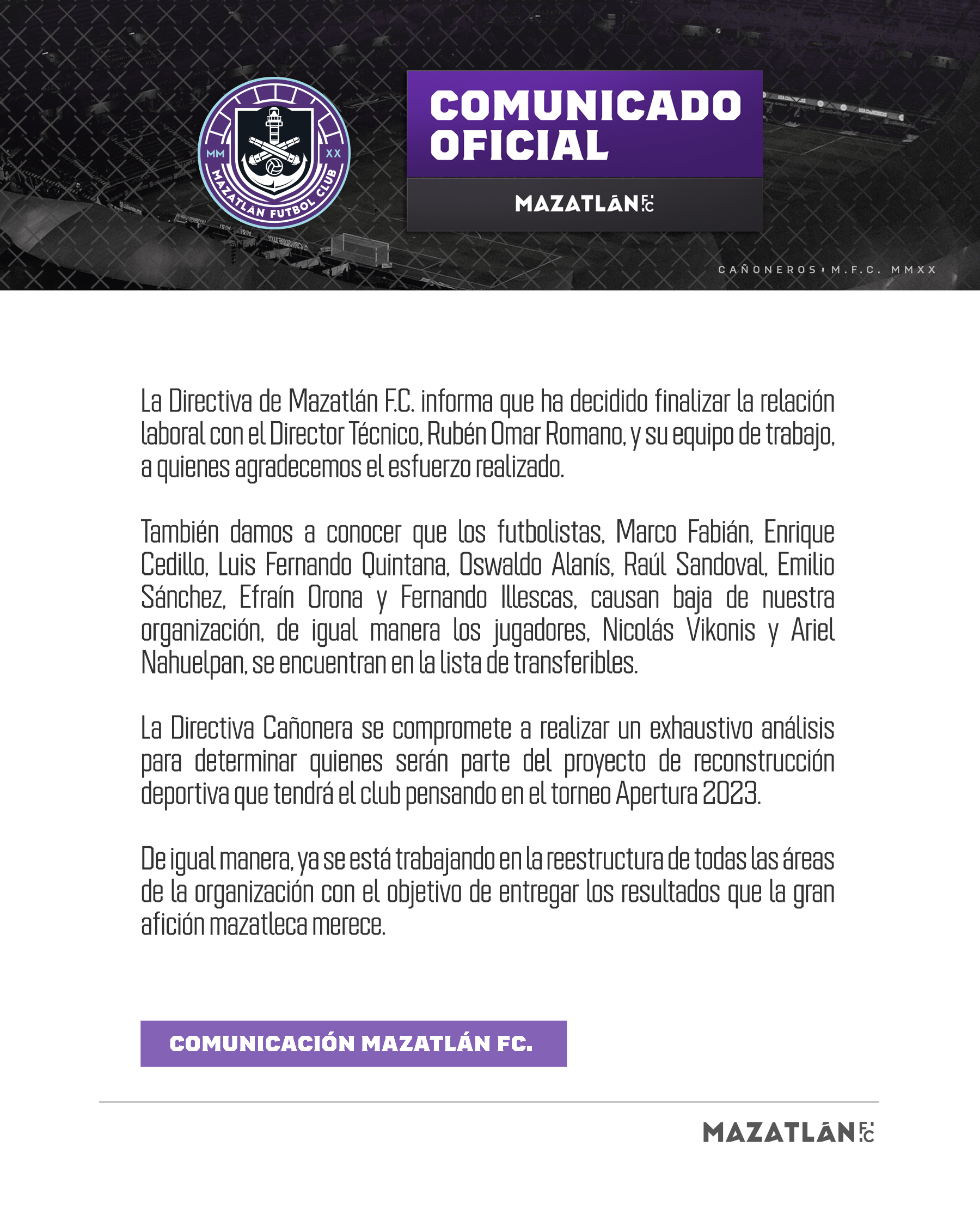 “La Directiva de Mazatlán F.C. informa que ha decidido finalizar la relación laboral con el Director Técnico, Rubén Omar Romano, y su equipo de trabajo, a quienes agradecemos el esfuerzo realizado”
