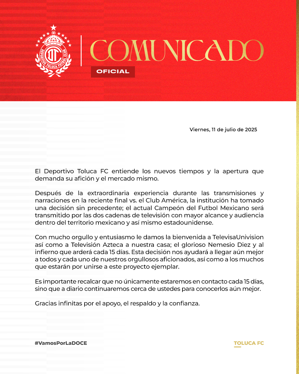 "Después de la extraordinaria experiencia durante las transmisiones y narraciones en la reciente Final contra el Club América, la institución ha tomado una decisión sin precedente: el actual Campeón del futbol mexicano será transmitido por las dos cadenas de televisión de mayor alcance y audiencia dentro del territorio mexicano, asimismo, estadounidense."Con mucho orgullo y entusiasmo le damos la bienvenida a TelevisaUnivision, así como a Televisión Azteca a nuestra casa: el glorioso Nemesio Diez y al infierno que arderá cada 15 días", se puede leer.