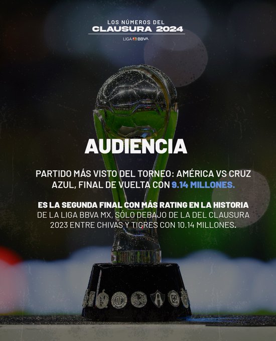La Final entre América y Cruz Azul fue el partido más visto del Clausura 2024 con 9.14 millones de espectadores y se convirtió en la segunda más vista en la historia de la Liga MX, sólo superada por la del Clausura 2023 entre Chivas y Tigres que alcanzó 10.14 millones.