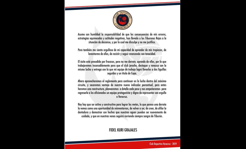 “Asumo con humildad la responsabilidad de que las consecuencias de mis errores, estrategias equivocadas y actitudes negativas han llevado a los Tiburones Rojos a la situación de descenso y por lo cual me disculpo”, señaló.