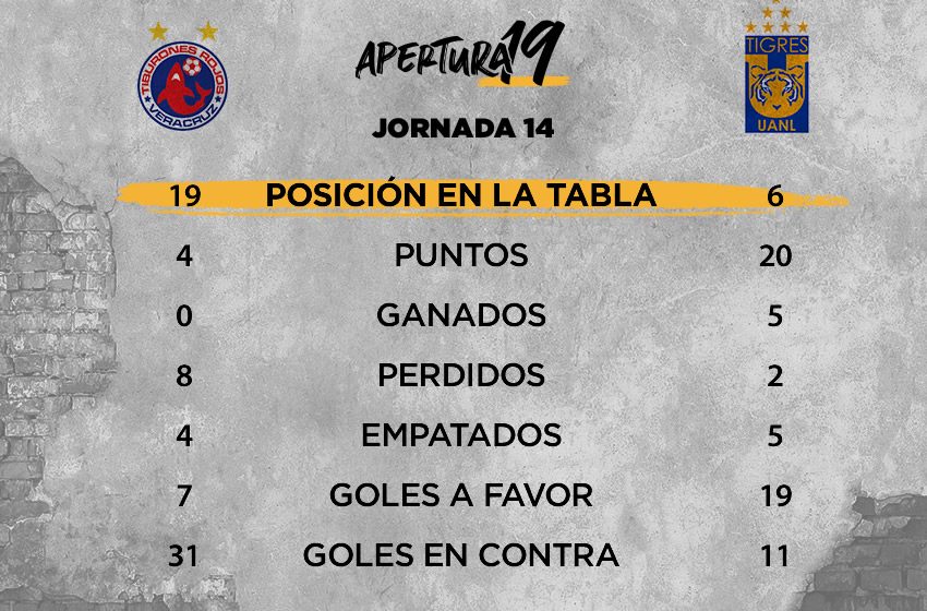 Mientras tanto, Tigres busca seguir subiendo escalones en la tabla general, tiene 20 puntos y es una jornada en la cual no pueden permitir dejar escapar los tres puntos ante una escuadra que solo cuenta con cuatro, es último en la clasificación y en la porcentual.