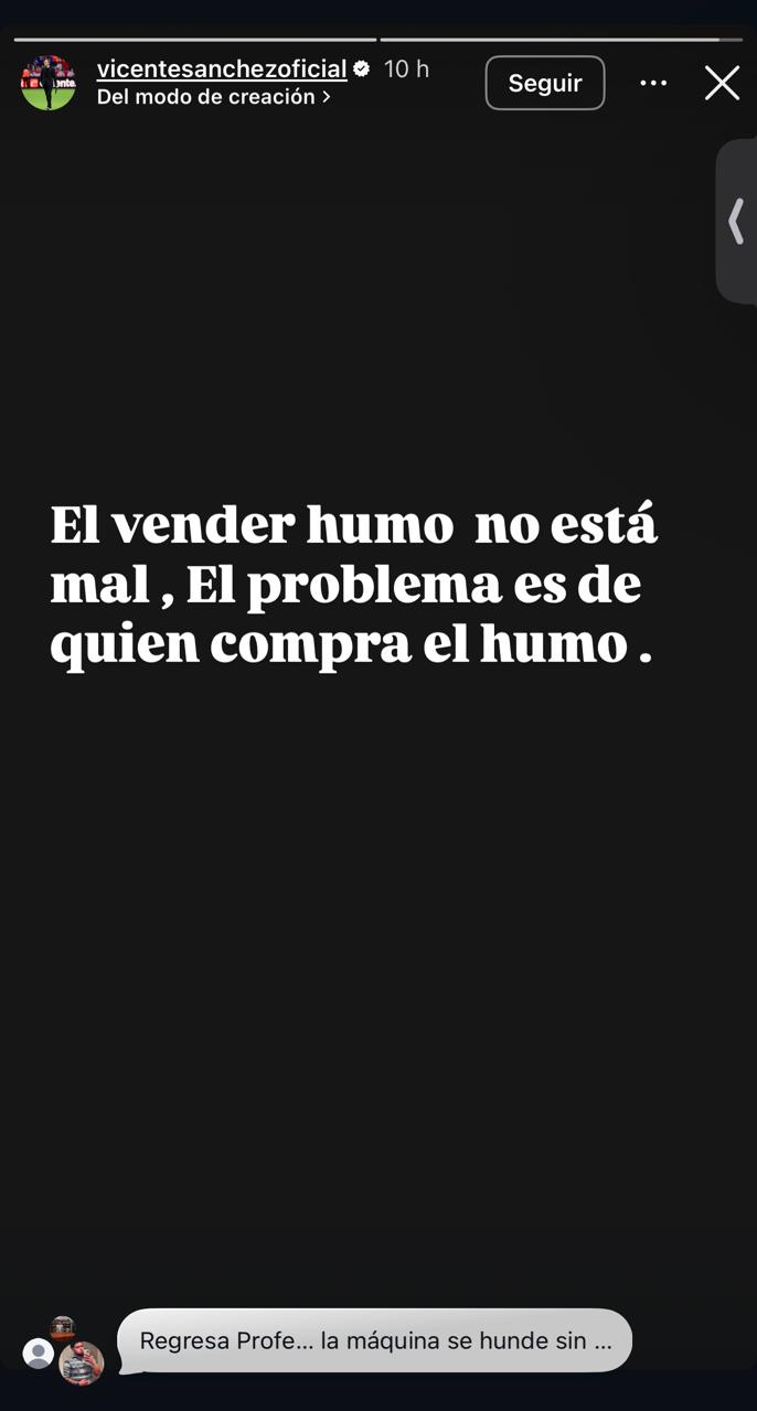 "Vender humo no está mal, el problema es de quien compra el humo", colocó Sánchez en sus historias de Instagram anoche, no precisamente tras el juego de Cruz Azul sino al finalizar la jornada sabatina de la Liga MX, por lo que también podría ser un señalamiento para Domenec Torrent, pero tiene menos relación considerando el contexto.