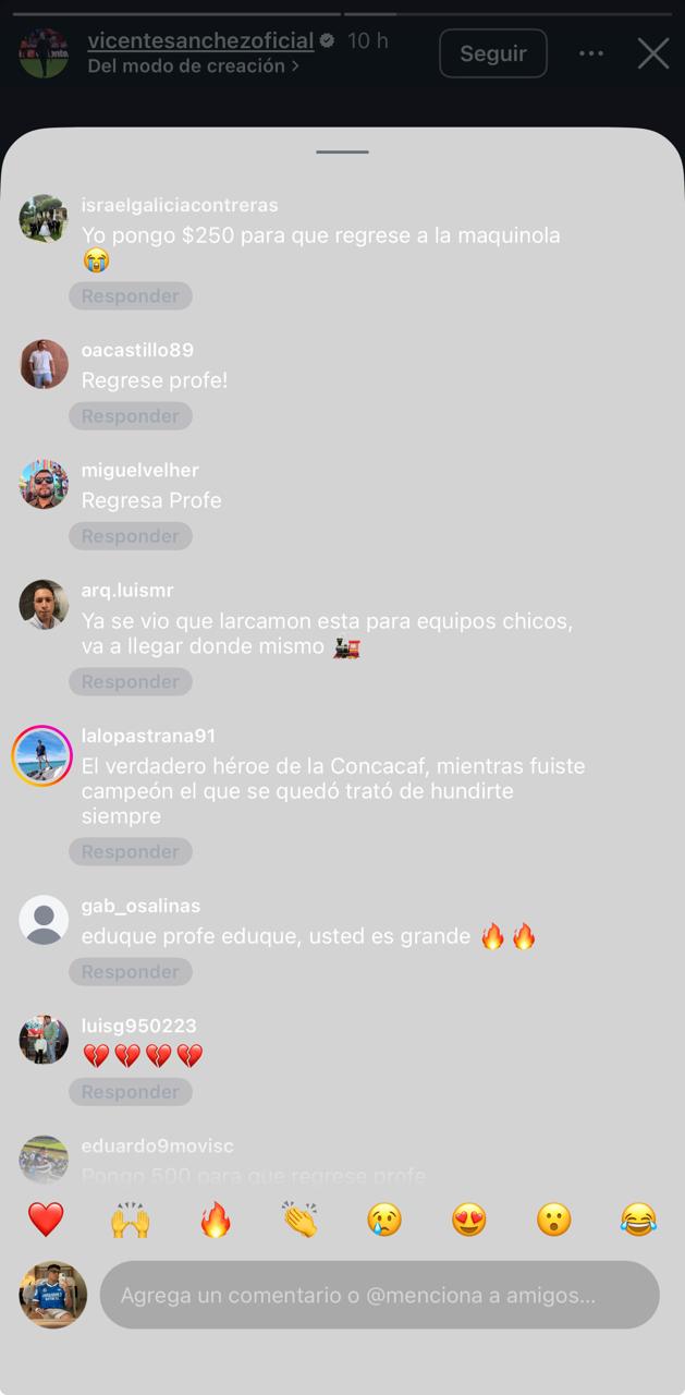 "Fuimos muy duros contigo", "Todos estamos con usted, profe", "Te extrañamos, profe", "Regresa profe, La Máquina se hunde sin ti", "Regrese Chente, lo extrañamos mucho", son algunas de las reacciones de los fans cruzazulinos en las redes sociales de Vicente Sánchez.