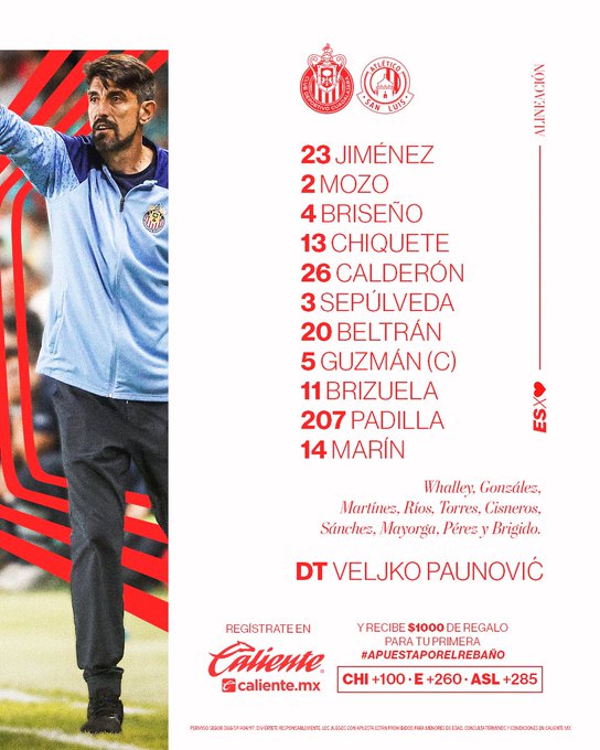 Chivas va con Miguel Jiménez en la portería. Alan Mozo, Antonio Briseño, Sepúlveda y Jesús Gilberto Orozco. Fernando Beltrán, Víctor Guzmán y Calderón. Arriba, Isaac Brizuela, Padilla y Ricardo Marín.