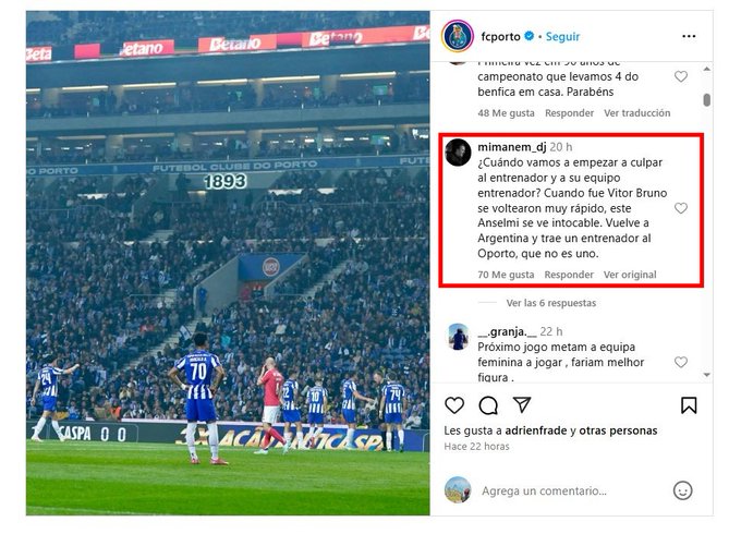 "¿Cuándo vamos a empezar a culpar al entrenador y al equipo del entrenador? Este Anselmi se ve intocable. Vuelve a Argentina y trae un entrenador al Porto, que no es uno"; "El tiempo de Anselmi, que no es entrenador del Porto, está contado"; "La plantilla no es buena, pero el entrenador, Dios mío... ¿era necesario ir a México a buscar un entrenador para hacer ese trabajo?"; "Gracias por nada Martin Anselmi, ¡Vergüenza!"; "A Anselmi lo tienen que correr hoy. Lo que pasó hoy en casa no se puede permitir", fueron algunos de los comentarios.