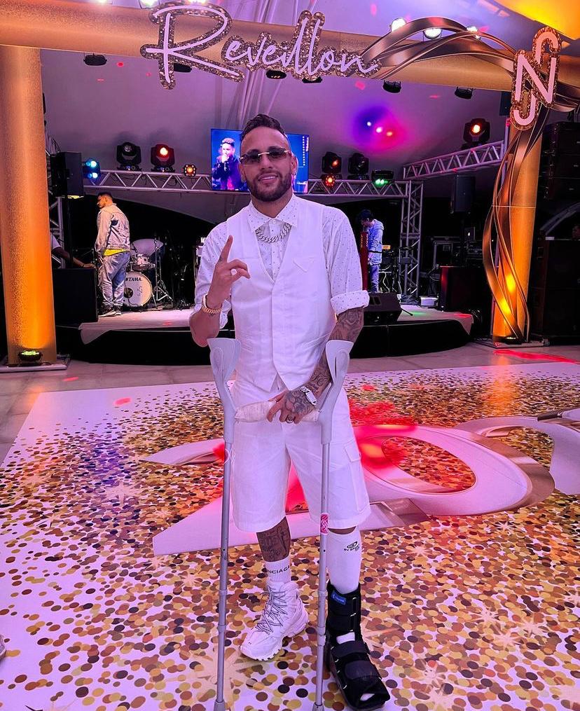 Siempre echando la casa por la ventana cuando de fiestas se trata con sus familiares y amigos, Ney Jr. organizó tremenda celebración para recibir el nuevo año, en la que solicitó a todos los presentes vestir de blanco. Él puso el ejemplo con unas bermudas, camisa y chaleco en ese color, además de joyería dorada y plateada, posando con muletas.