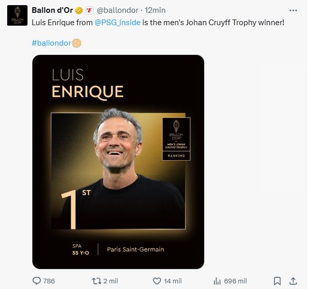 Luis Enrique, de 55 años de edad, dirigió un mensaje de agradecimiento en video, posando junto al trofeo. "Querría dar las gracias (al presidente del PSG) Nasser Al-Khelaïfi y sobre todo (al consejero deportivo) Luis Campos", declaró Luis Enrique. "Lo más importante es el reconocimiento de los aficionados".