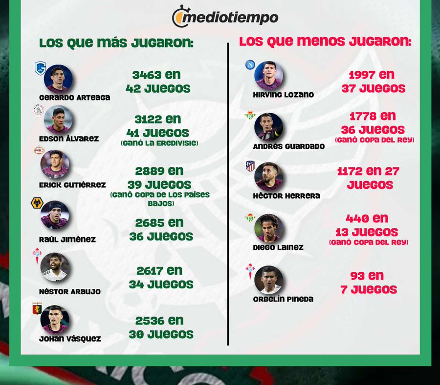 Hirving Lozano (Napoli) y Jesús Manuel Corona, quien inició la campaña con el Porto y la concluyó con el Sevilla, fueron los otros dos representantes nacionales que menos minutos sumaron, aunque tuvieron participación en 37 y 40 juegos a lo largo del año futbolístico, respectivamente.