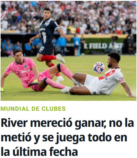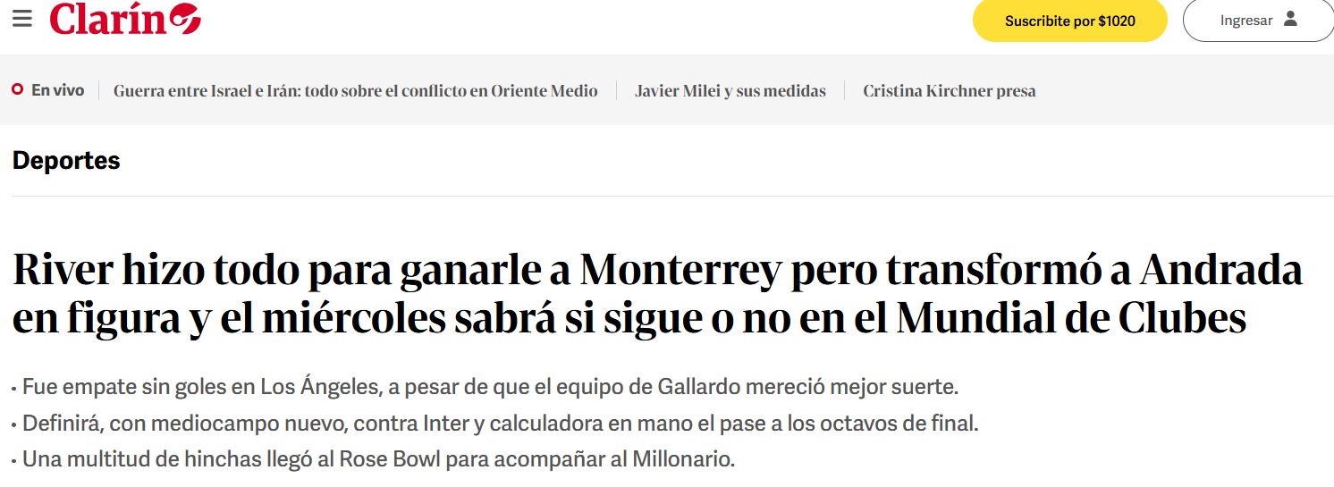 En tanto que el medio Clarín publicó en su sitio web: "River hizo todo para ganarle a Monterrey pero transformó a Andrada en figura y el miércoles sabrá si sigue o no en el Mundial de Clubes".