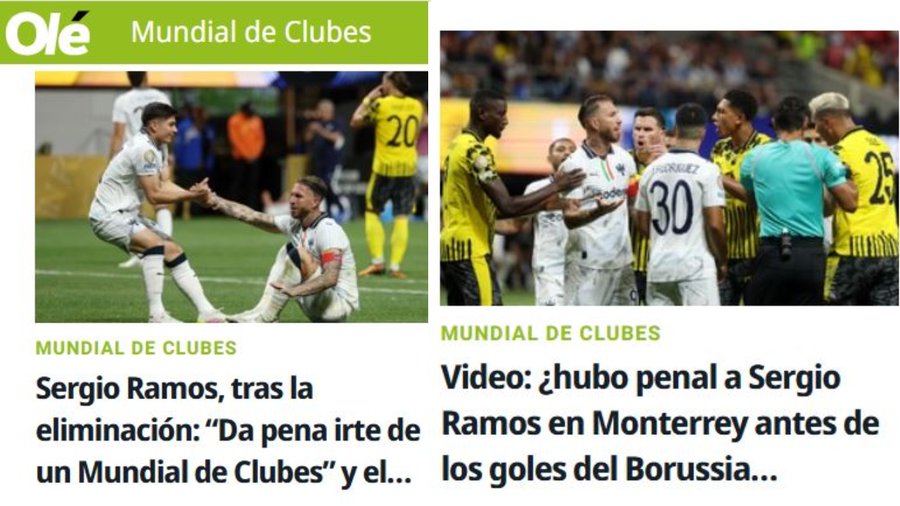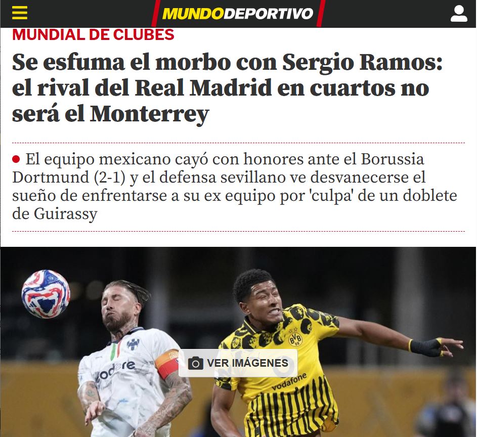 "Se esfuma el morbo con Sergio Ramos: el rival del Real Madrid en Cuartos no será el Monterrey. El equipo mexicano cayó con honores ante el Borussia Dortmund (2-1) y el defensa sevillano ve desvanecerse el sueño de enfrentarse a su ex equipo por 'culpa' de un doblete de Guirassy", publicó Mundo Deportivo.