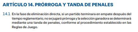 "En la fase de eliminación directa, si un partido terminara en empate después del tiempo reglamentario, no se jugará prórroga y la selección ganadora se determinará mediante una tanda de penales, conforme al procedimiento establecido en las Reglas de Juego", señala el reglamento.