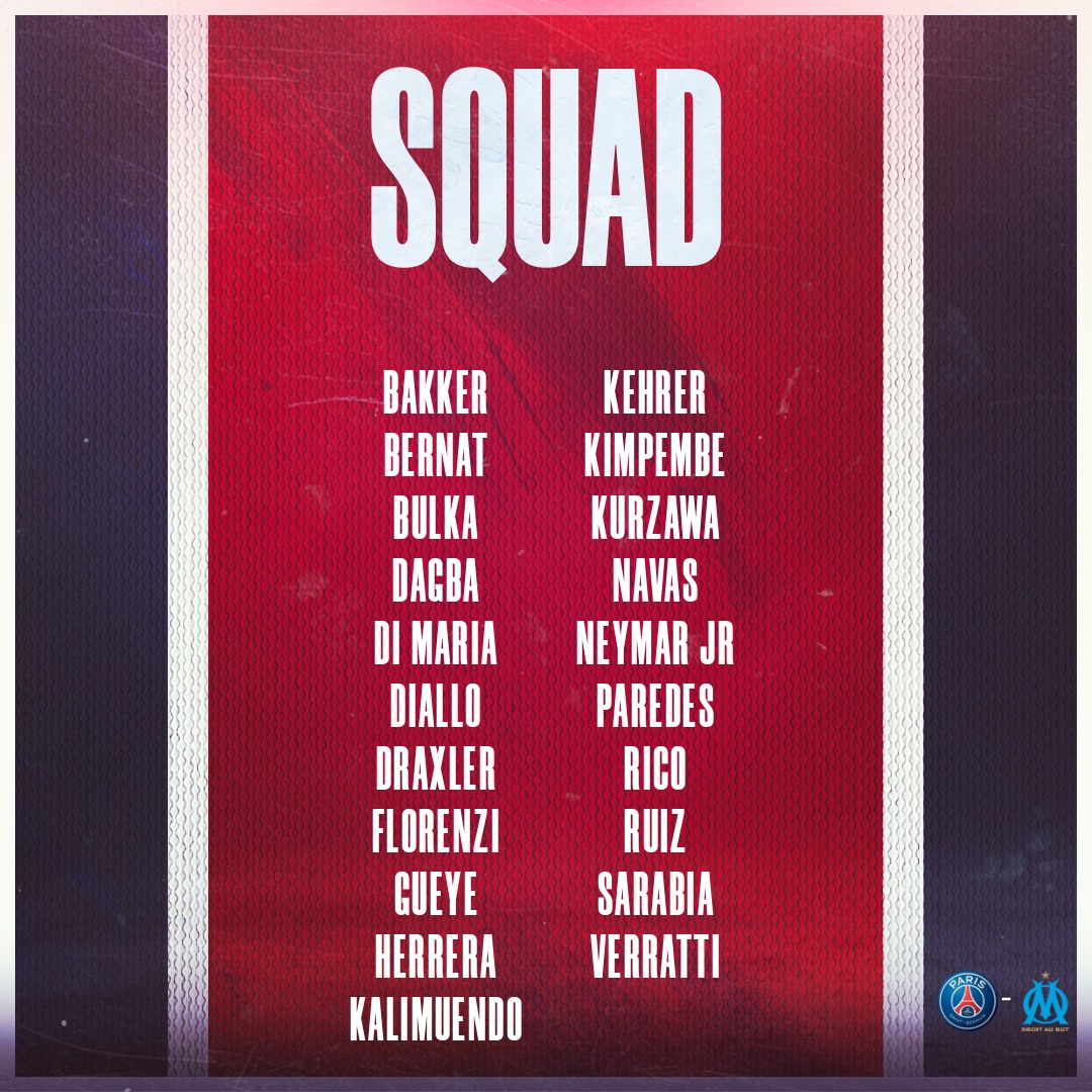 Neymar, Angel Di Maria, Leandro Paredes y Keylor Navas, ausentes en el primer partido de Ligue 1 del PSG en Lens debido al test positivo al coronavirus, están como era previsible en la convocatoria para el choque contra Marsella el domingo.