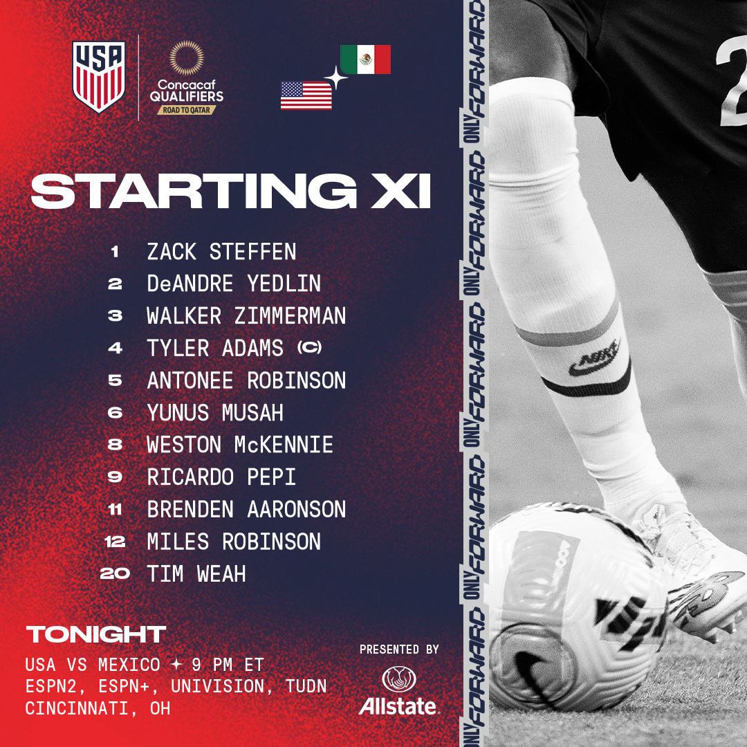 Zack Steffen (P); DeAndre Yedlin, Walker Zimmerman, Miles Robinson, Antonee Robinson; Yunus Musah, Tyler Adams, Weston McKennie; Brenden Aaronson, Tim Weah y Ricardo Pepi.