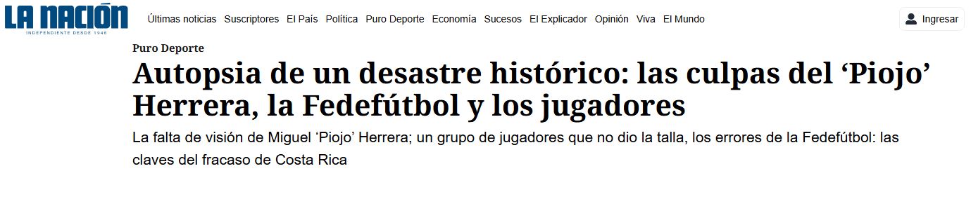 El diario La Nación también se refirió al trabajo del Piojo, mismo al que no dudó en culpar de que la selección de Costa Rica se quedara fuera de la próxima Copa del Mundo, aunque culpó a los jugadores y hasta la Fedefutbol.