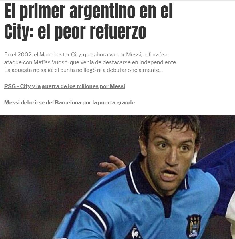 En medio de todo el revuelo que causó el rumor de que Lionel Messi ficharía con el Manchester City, en Argentina se dieron a la tarea de analizar cuál ha sido la 'peor contratación' de los Citizens en cuanto a futbolistas pamperos se refiere y el Diario Olé no tuvo empacho en señalar a Vicente Matías Vuoso.