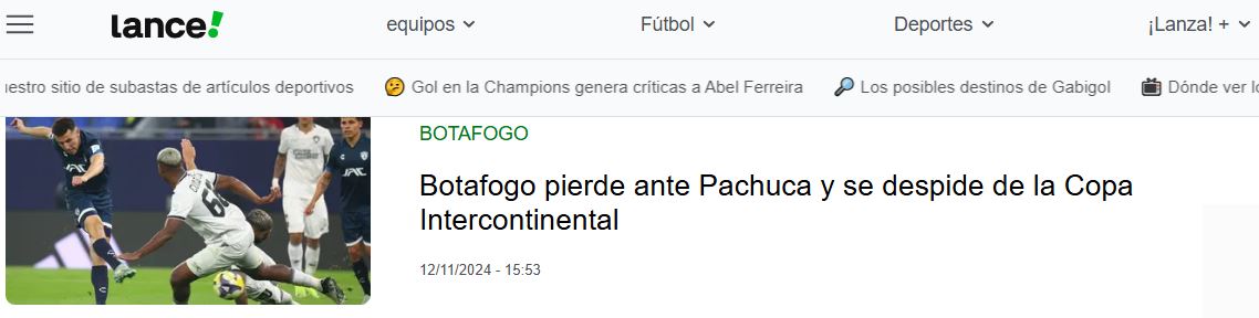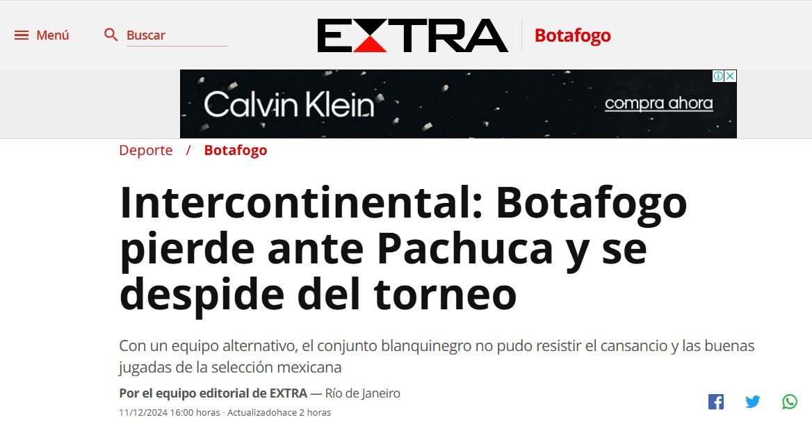 "El sueño del Botafogo en la Copa Intercontinental duró poco. El equipo cayó derrotado por Pachuca por 3-0 en su debut y ya se despidió del torneo FIFA, celebrado en Doha, Qatar", publicó el medio Extra, el cual también destacó el buen futbol que mostraron los Tuzos.
