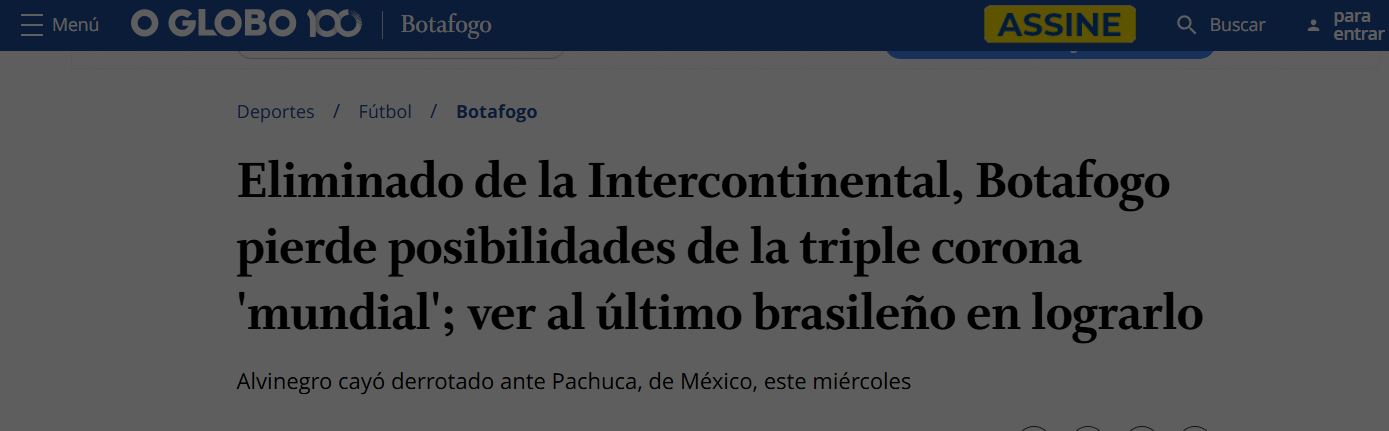 O Globo habló del fracaso que sumó el Botafogo en la Copa Intercontinental y de como dejó ir la posibilidad de conseguir el triplete, pues además de la Copa Libertadores recientemente el equipo de Río de Janeiro conquistó el título del Brasileirão.