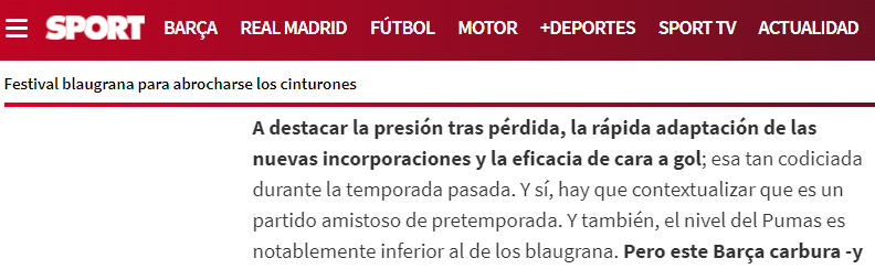 "Hay que contextualizar que es un partido amistoso de pretemporada. Y también, el nivel del Pumas es notablemente inferior al de los blaugrana. Pero este Barça carbura -y de qué manera- antes de debutar en competición oficial el próximo sábado 13 contra el Rayo Vallecano", señala el referido medio.