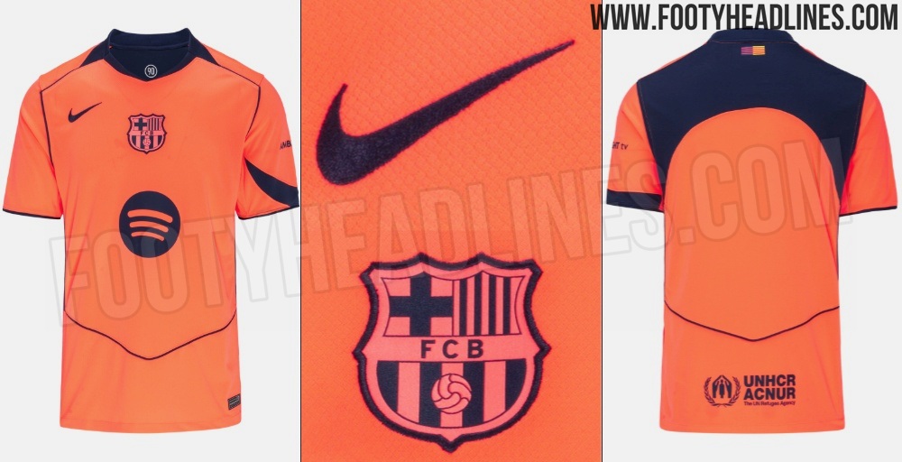 El portal especializado en indumentaria deportiva, Footy Headlines, filtró las primeras fotografías oficiales de la tercera camiseta del Barcelona para la campaña que está por comenzar, la cual saldría en color naranja fosforescente y vivos en azul, ello bajo el template de Total 90.