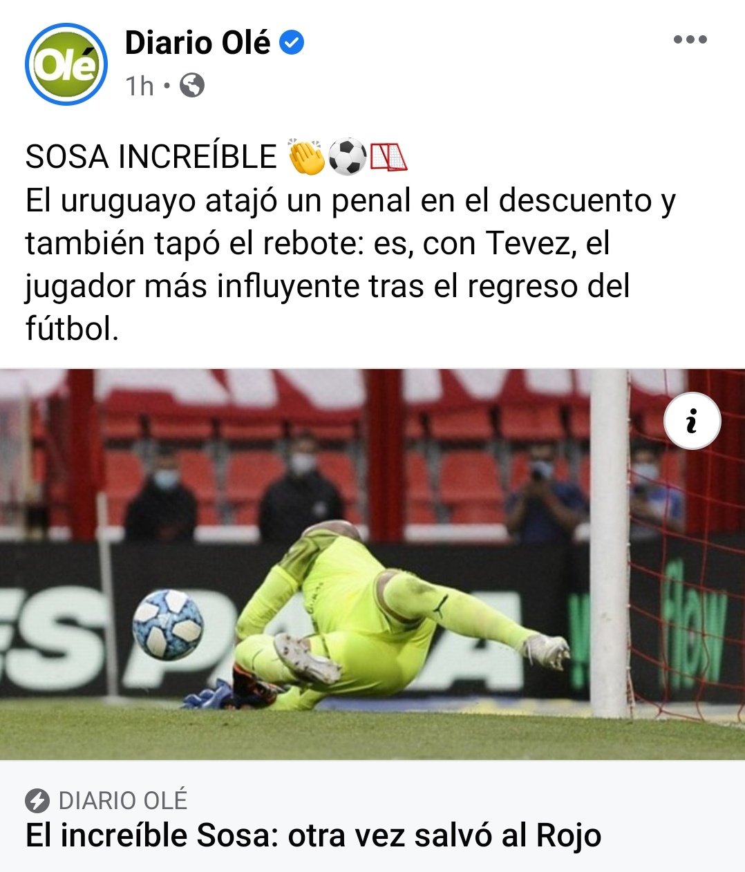 Los halagos fueron porque Sebastián Sosa atajó un penal al 95' que evitó la derrota de Independiente ante Colón de Santa Fe. No solo eso, igualmente fue ágil como felino para evitar el contrarremate al borde del área chica.