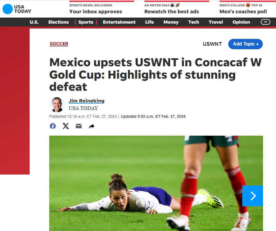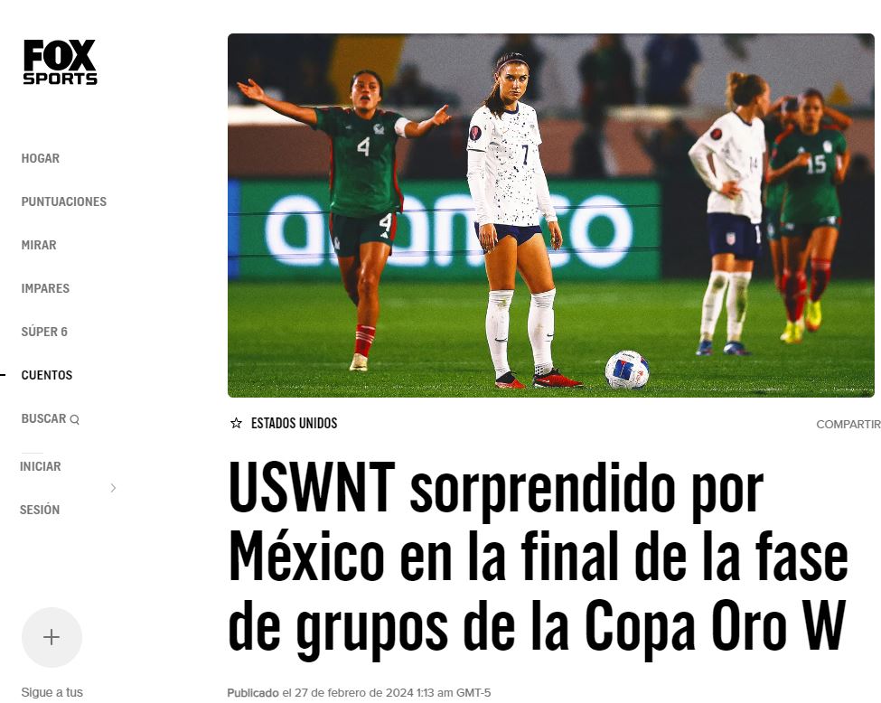 “El lunes por la noche se hizo historia en el Dignity Health Sports Park en Carson, California, pero no del tipo que el equipo nacional femenino de Estados Unidos quiera festejar o recordar (...) Para México, sin embargo, fue un resultado trascendental que causará conmoción en todo el mundo del futbol".