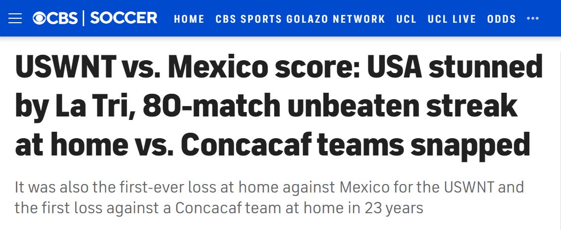 “La derrota rompe una racha invicta de 80 partidos en casa del equipo femenil de Estados Unidos contra equipos de Concacaf, siendo la última derrota por 3-1 ante Canadá en noviembre de 2000. Fue la primera derrota del Team USA contra México desde 2010”