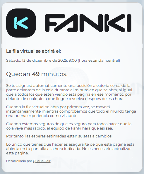 Se detalla que el tiempo de espera estimado estará sujeto a cambios, pues el equipo de Fanki hará todo lo posible para agilizar la fila virtual en cuanto sea posible.