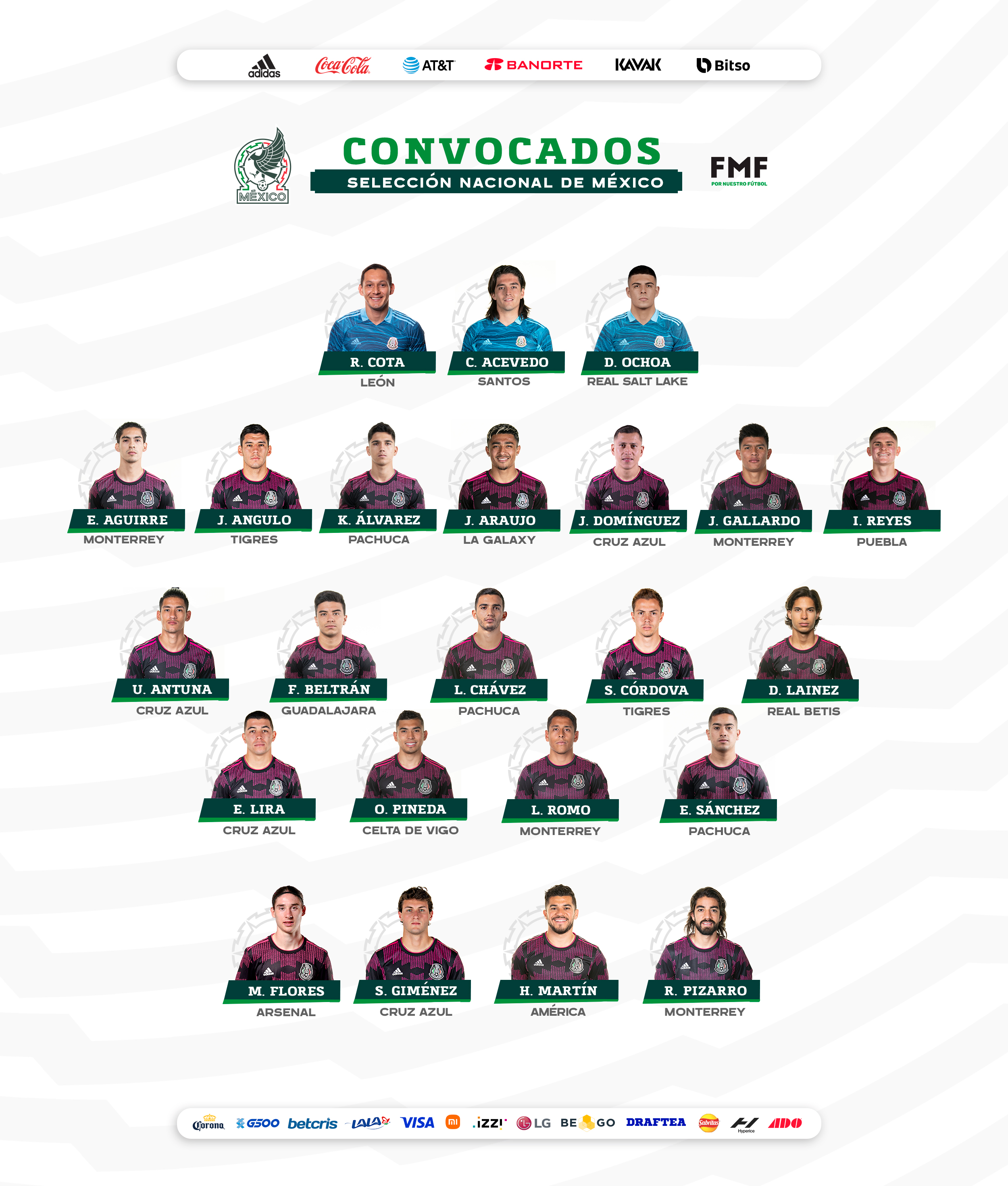 Hay dos que pertenecen a equipos de la Major League Soccer, uno es el portero David Ochoa del Real Salt Lake -quien se sumó a la escuadra sin haber estado citado para los amistosos ante Nigeria, Uruguay y Ecuador- y el segundo es Julián Araujo, lateral del LA Galaxy; los 18 elementos restantes militan en la Liga MX, con Rayados y Cruz Azul como los que más aportan con cuatro cada uno.