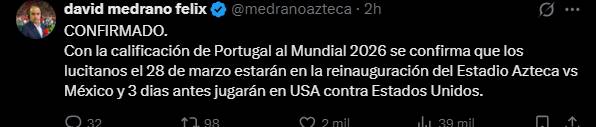 David Medrano, columnista de mediotiempo, aseguró que está confirmado que México y Portugal se enfrentarán en el próximo mes de marzo para lo que será la reapertura del Estadio Banorte, en donde se disputará la inauguración de la Copa del Mundo.