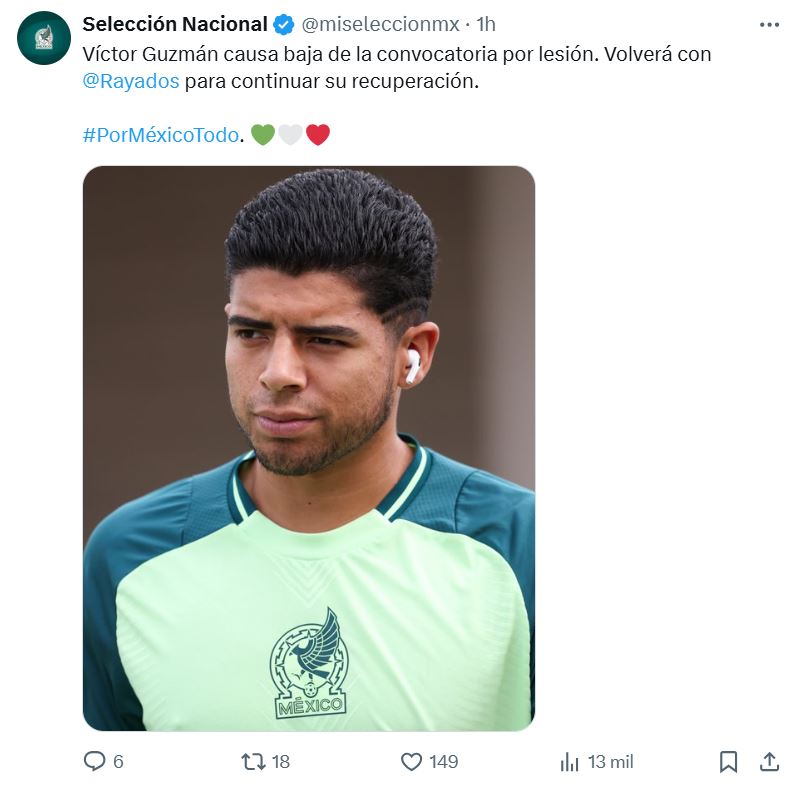 ¡Malas noticias! En el primer día del microciclo de la Selección Mexicana rumbo a la Copa del Mundo 2026, el equipo de jugadores que llamó Javier Aguirre sufrió la baja de Víctor Guzmán, elemento de Rayados de Monterrey.