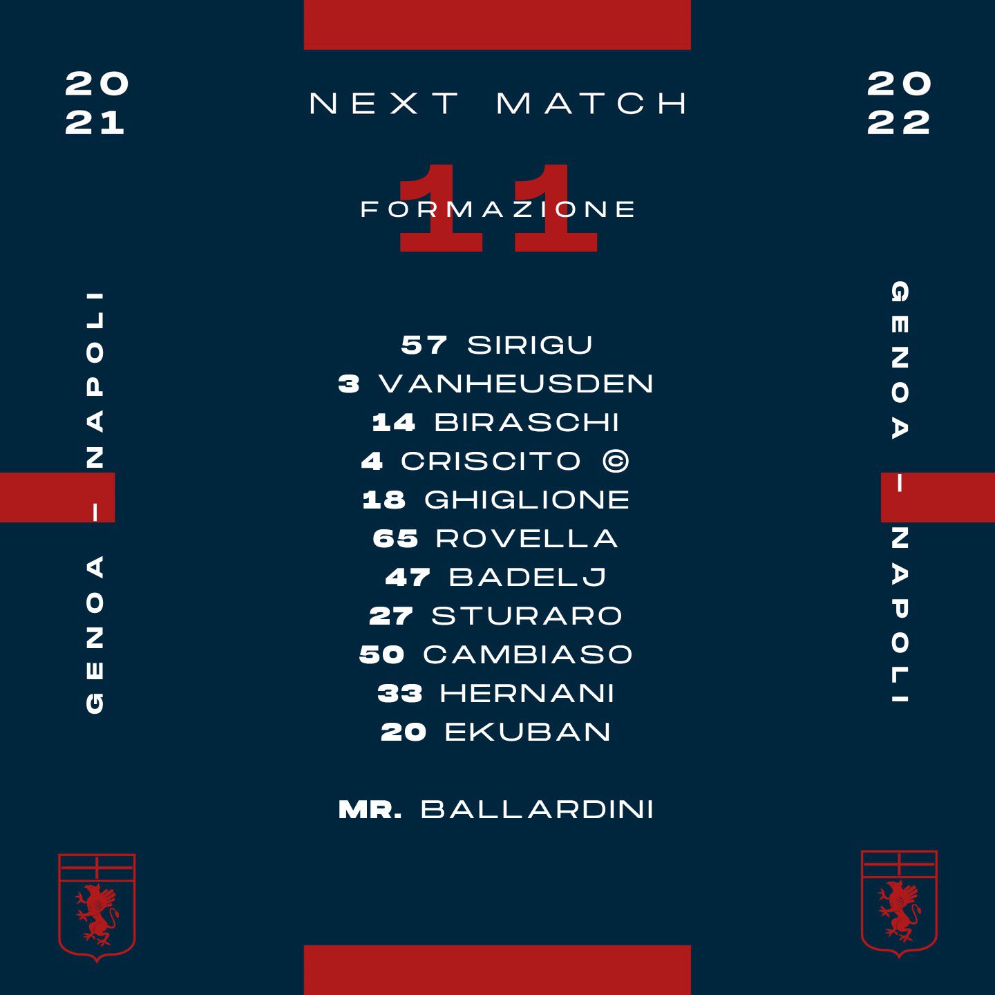 Salvatore Sirigu (P); Zinho Vanheusden, Davide Biraschi, Domenico Criscito, Andrea Cambiaso; Nicolò Rovella, Milan Badelj, Stefano Sturaro, Hernani; Paolo Ghiglione y Caleb Ekuban.