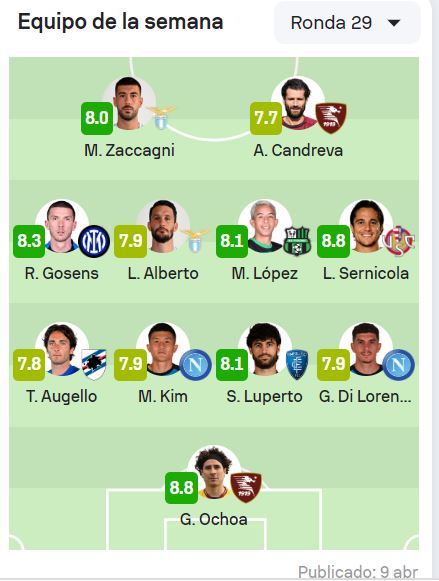 De acuerdo con Sofascore, Ochoa obtuvo la calificación de 8.8, puntuación más alta que se le dio a todos los jugadores que fueron incluidos en el XI; Leonardo Sernicola del Cremonese también recibió la misma calificación.