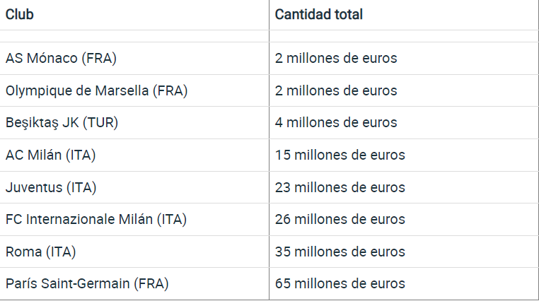 Todos estos equipos tienen opción de pago a plazos por un periodo máximo de cuatro años, que fue el elegido por el Inter y la Roma, mientras que los seis restantes liquidarán la deuda en tres años. En el caso del PSG deben hacer un pago inmediato de 10 millones de euros y los 55 restantes a solventar a partir de ahora hasta el 2025.