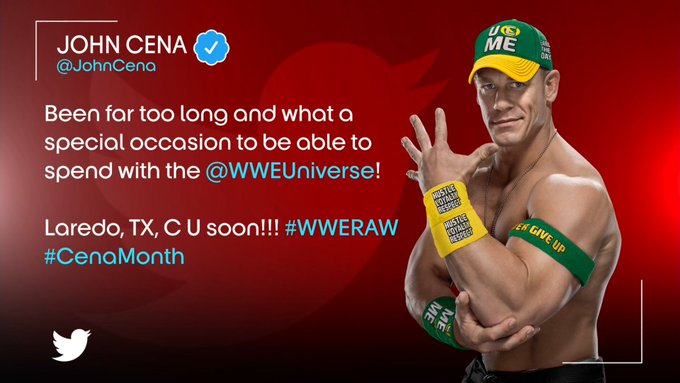 BREAKING NEWS: @JohnCena returns to #WWERaw on Monday, June 27 to celebrate his 20 Year Anniversary with @WWE. pic.twitter.com/l8yurlx2wX