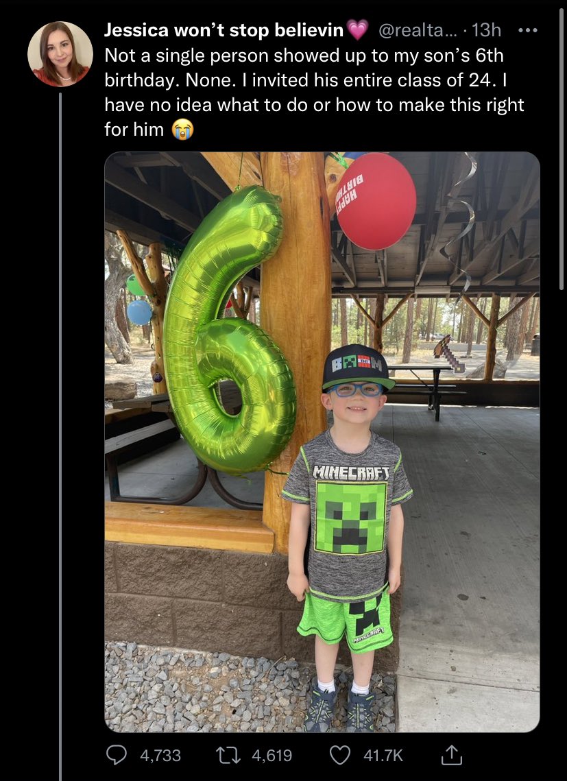 Esta historia viral en Twitter fue divulgada por Jessica, la madre del niño, quien explicó lo devastada que estaba porque nadie acudió a la celebración que organizó a Landon, de quien compartió una imagen junto a un globo con el número 6 completamente solo en lo que parece un salón en un bosque.