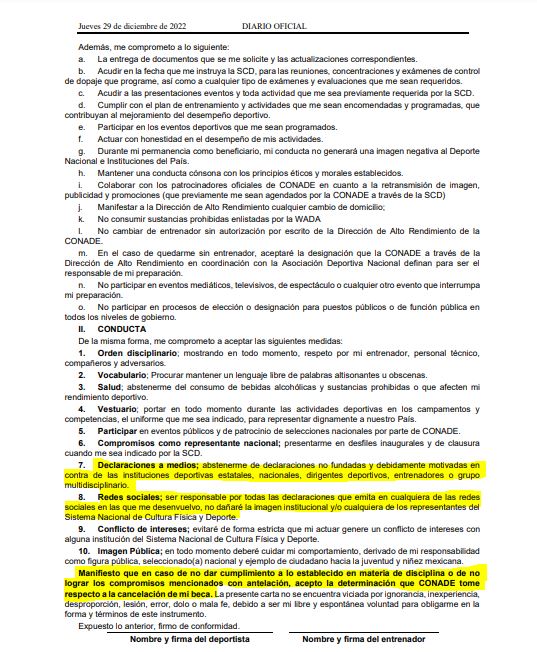 El documento “Reglas de Operación del Programa de Cultura Física y Deporte para el ejercicio fiscal 2023” (ACUERDO número 30/12/22), que entró en vigor el pasado 1 de enero, tiene varios puntos a los que los deportistas mexicanos de alto rendimiento se comprometieron, aunque uno llamó mucho la atención y es el que se refiere a la 'Conducta' en la 'Carta de aceptación-compromiso'.