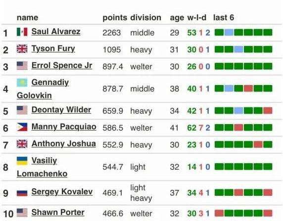 Detrás del jalisciense se encuentran el británico Tyson Fury y el norteamericano Errol Spence en la segunda y tercera plaza con mil 95 y 897.4 puntos, respectivamente.
