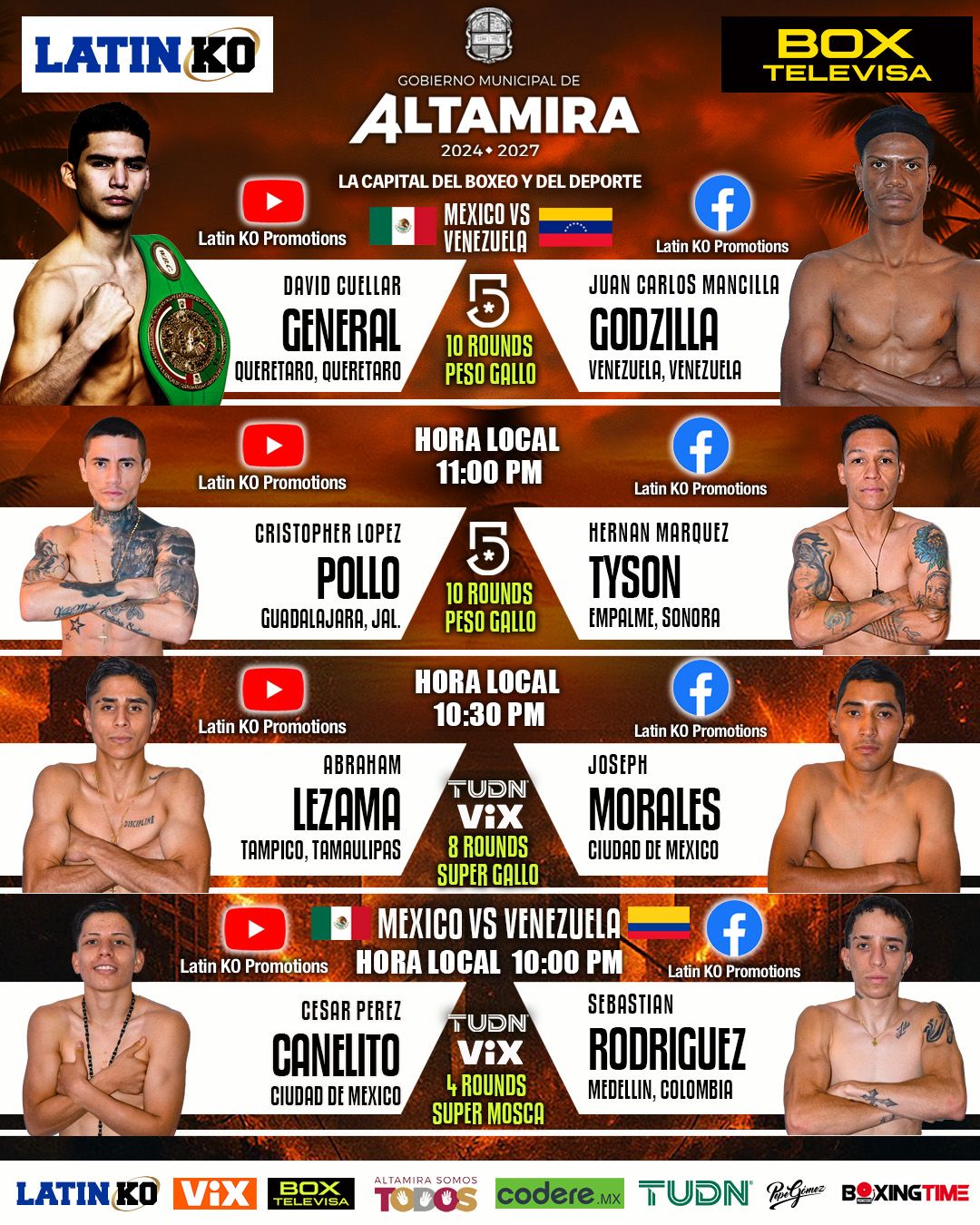 La velada estará encabezada por "el General" Cuéllar, quien se medirá ante ante Juan Carlos Mancilla, con el primero buscando volver a las carteleras de primer nivel, mientras que en la coestelar estarán Cristopher "Pollo" López y Hernán "Tyson" Márquez.
