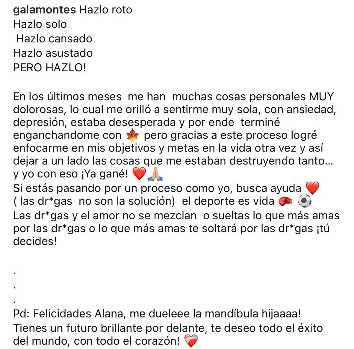 Gala Montes escribió de forma motivacional: "Y yo con eso ¡Ya gané! Si estás pasando por un proceso como yo, busca ayuda (las drogas no son la solución) el deporte es vida. Las drogas y el amor no se mezclan o sueltas lo que más amas por las drogas o lo que más amas te soltará por las drogas ¡tú decides!".