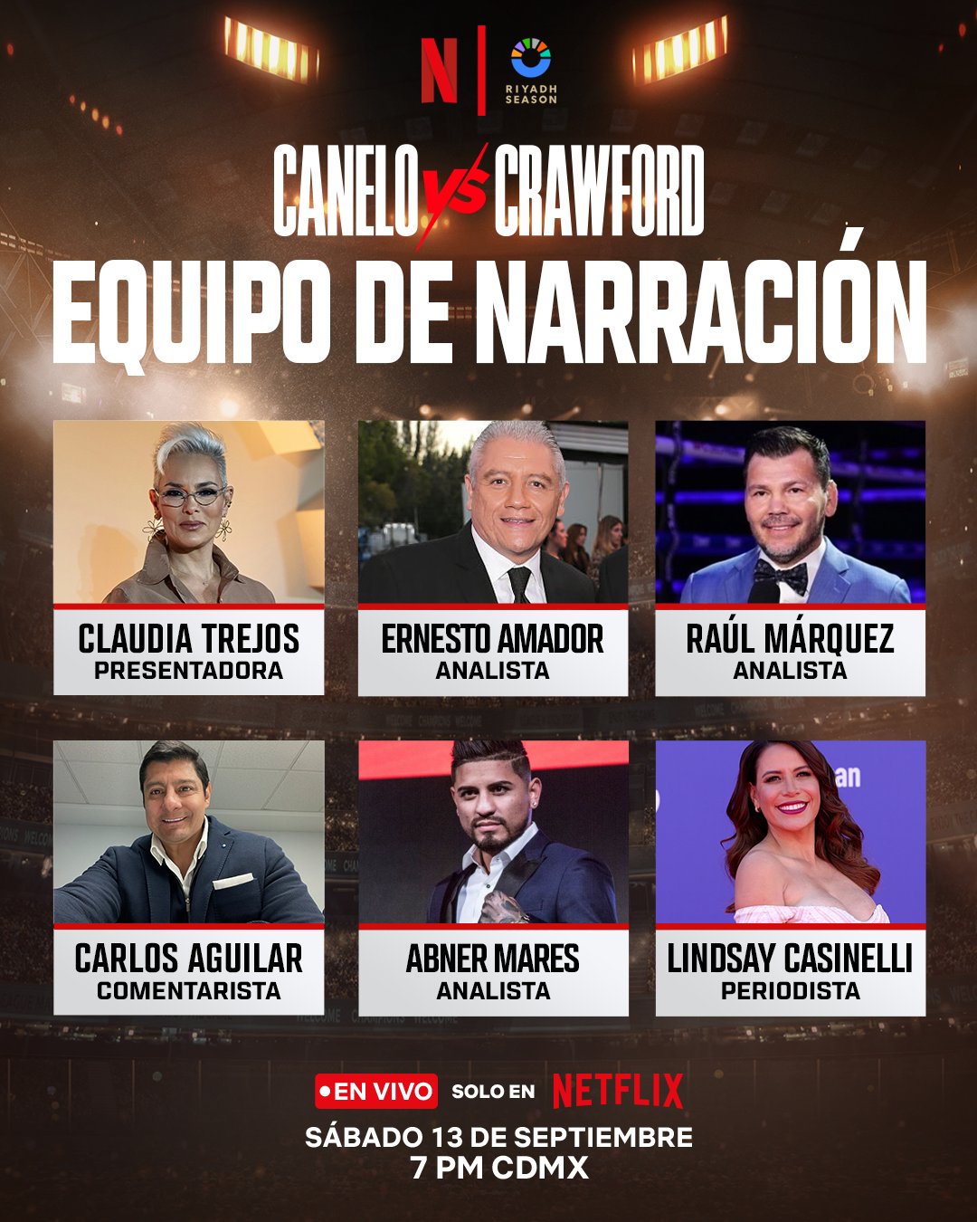 Netflix, cadena que cuenta con los derechos de la transmisión de la pelea entre Saúl "Canelo" Álvarez y Terence Crawford, dio a conocer al equipo que se encargará de las transmisiones el próximo 13 de septiembre, con una agradable sorpresa para los aficionados al boxeo.