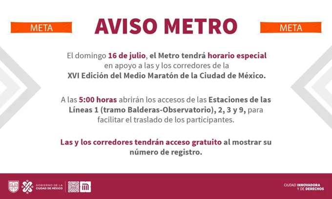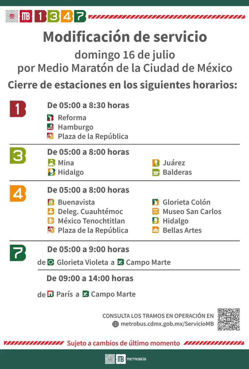 Por otro lado, el Metrobús dio a conocer que las líneas 1, 3, 4 y 7 no darán servicio mientras se esté llevando a cabo el Medio Maratón de la Ciudad de México.