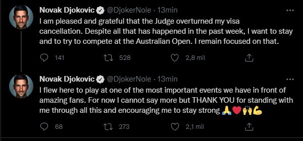 "Estoy concentrado (en el Australian Open). Estoy feliz y agradecido por el hecho de que el juez haya revocado la anulación de mi visado. Pese a todo lo que ha pasado, quiero quedarme e intentar participar en el Abierto de Australia. He venido aquí a disputar uno de los más importantes torneos ante espectadores increíbles", escribió.