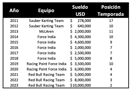 Este 2023 sella la gran carrera que ha tenido en la Fórmula 1, ya asegurando el subcampeonato de pilotos con 273 puntos a una carrera de finalizar la temporada y al momento 9 podios: Baréin 2do, Arabia Saudita 1ro, Azerbaiyán 1ro, Miami 2do, Austria 3ro, Hungría 3ro, Bélgica 2do, Italia 2do y Las Vegas 3ro.