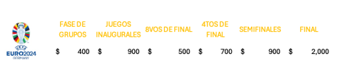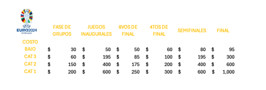 Por supuesto hay boletos premium que también están agotados desde semanas previas, los cuales vemos en la tabla anterior y que, en costo autorizado oficial van: en Fase de Grupos $ 400 euros, Juegos inaugurales de fases $ 900 euros, 8vos de final $ 500 euros, 4to de final $ 700 euros, Semifinales $ 900 euros y la fnal $ 2,000 euros. Claro la reventa legal e ilegal va a elevar estos costos, pero oficialmente estos son los ingresos ya estipulados por UEFA.