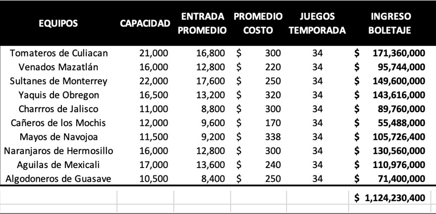 De acuerdo al calendario, en promedio los equipos tendrán 35 juegos de local en la temporada regular, por lo que multiplicamos el estimado de asistencia, por el promedio de costo de los boletos por el número de juegos. Tentativamente la suma de los ingresos de los equipos nos da $ 1,124.2 MDP.