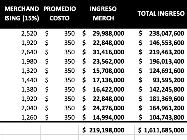 Como lo hemos analizado en esta columna a través de las semanas y además nos encanta hacer números y ejercicios tentativos de ingresos, hicimos un escenario de los ingresos de los equipos en el útlimo rubro comentado: Ticketing, insumos, merchandising. Para visualizar el potencial que la LAMP y sus equipos tienen en una temporada que se ve corta en el calendario, pero intensa para los fans.